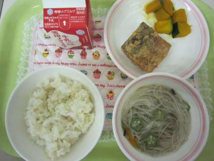 ☆ 今日の献立 ☆  ・玄米ご飯  ・牛乳  ・さばのたつたあげ  ・かぼちゃの煮つけ  ・七夕そうめん