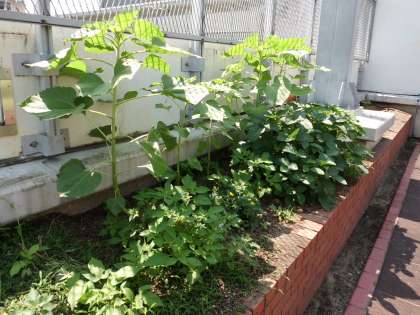 運動場の花壇では,3年生が育てているヒマワリやホウセンカがすくすくと元気がよく,5・6組が育てているカモナスもおいしそうにまるまると太っています。