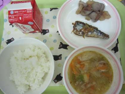 ☆ 今日の献立 ☆ ・ごはん ・牛乳 ・さんまのかわり煮 ・里芋とこんにゃくの土佐煮 ・キャベツの吉野汁