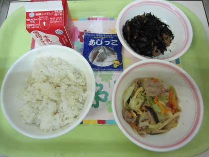 ☆ 今日の献立 ☆  ・麦ごはん  ・牛乳  ・豚肉とキャベツの味噌炒め  ・ひじきの煮つけ  ・じゃこ