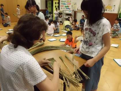 笹の葉,わら,イグサを使って,1つずつ手作りします。10個1セットであのおなじみのちまきができます。ちまき作りをされている方は,おばあちゃんの代からずっとちまき作りに携わっていること,祇園祭で売られているちまきの数の多さ,1年間かけてちまきを作っていることなどを聞いて,子どもたちは大変驚いていました。