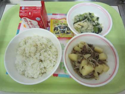 ☆6月15日の献立☆ ・麦ごはん・牛乳・肉じゃが・切干大根の煮つけ・黒大豆