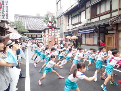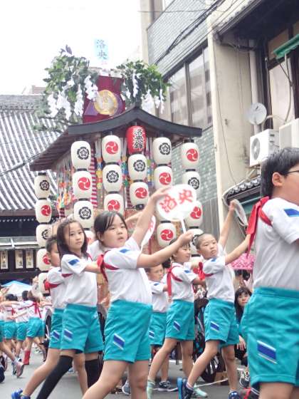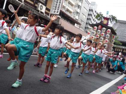 因幡薬師前で2年生が祇園囃子「つくし」に合わせた踊りを披露しました。