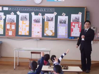 1年2組は、どんぐりや松ぼっくりなど、お気に入りの秋の宝物の特長を生かして屋台の看板作りをする授業を公開しました。