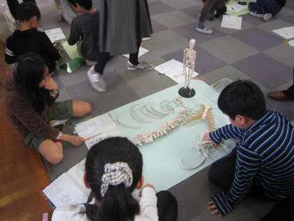 等身大の人体の骨格模型に触れながら、頭・背・腕・脚などの部位の骨格を注意深く観察し、骨のはたらきについて気づいたことを交流していました。