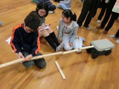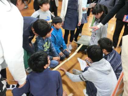 京都の夏を彩る祇園祭。交差点で巡行する鉾の向きを変える辻回し。この辻回しをてこのはたらきを利用してできるだけ小さな力で行うにはどうすればいいか,について実験を重ねながら考えました。京都ならではの素材を取り上げた学習です。