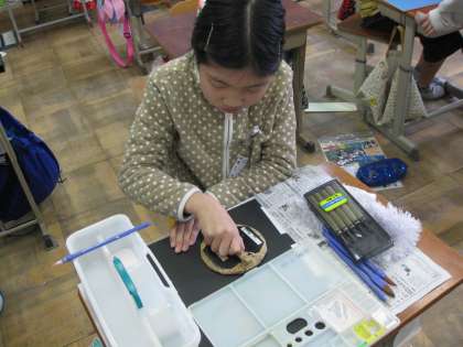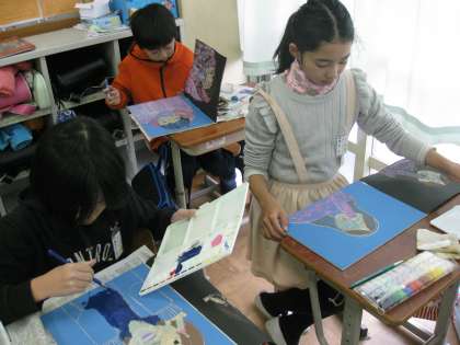 図画工作科の学習では,版画の制作を進めています。彫刻刀で彫り終え,絵の具で板に色を塗って黒和紙に刷っているところです。自分の作品の完成に向かって頑張っています。