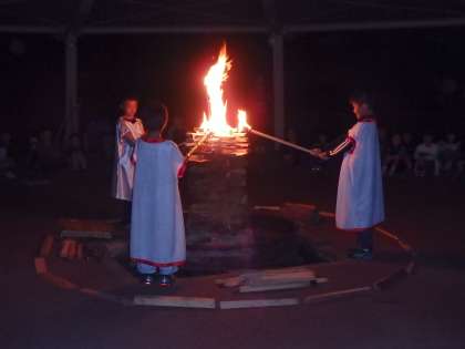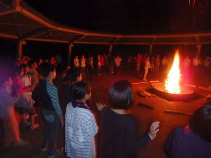 3日目の最後はキャンプファイヤーです。火の神から炎をもらい,点火しました。レクレーション係がゲームや歌で盛り上げました。とても楽しいキャンプファイヤーになりました。いよいよ最終日です。感謝の気持ちをもって活動を進めたいと思います。