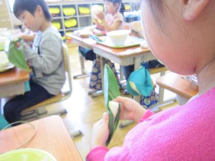 また,「ちまき」もこどもの日に食べるお菓子として紹介しました。1年生も上手に笹の葉をむいて,食べていました。「おいしかったよ」「笹の葉のにおいが苦手だったけど,食べたらおいしかったよ」と感想を教えてくれました。食べ終わった後も上手に笹の葉を片づけることができました。