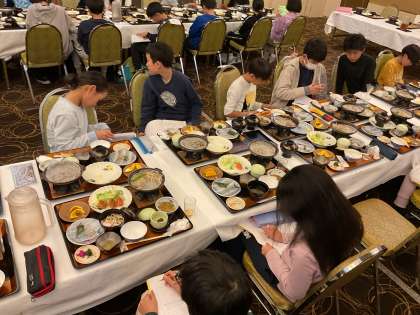 話し合ったことを基にそれぞれでまとめています。このふりかえりの後は、各部屋に戻って就寝準備をします。明日も元気に過ごせるように、しっかり休みたいと思います。
