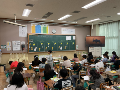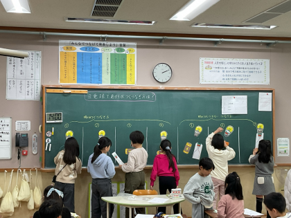 理科「電気で明かりをつけよう」の単元で、豆電球に明かりをつけるためには、どのように豆電球・導線・乾電池を繋げばよいかということを考えました。なかなかユニークな考えもあり、この後も、面白い授業展開になりそうです。