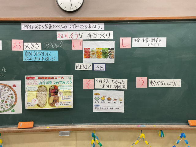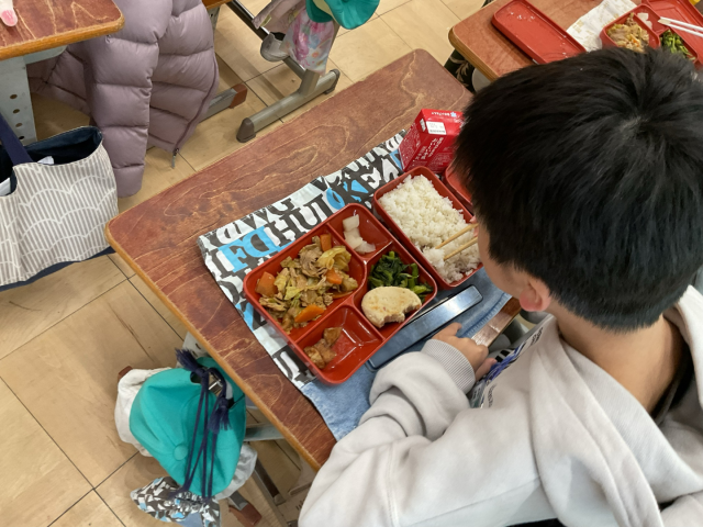 事前に、中学生に必要な栄養を取ることができるお弁当とはどのようなものかを学習し、今日の試食会を迎えました。「小学校の給食とは違うのかな。」「量はどのくらいかな。」とドキドキした様子でしたが、メインメニューの回鍋肉や副菜を味わいながら食べていました。