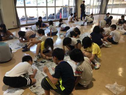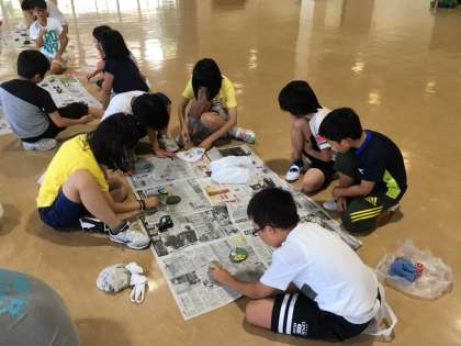 若狭の思い出を作成中です。磯観察で拾ってきた石に、思い思いのメッセージと絵を書いています。