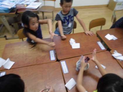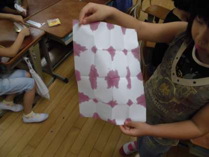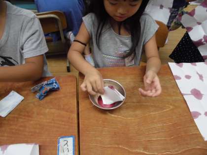 生活科では朝顔で色水作りをしました。春から毎日頑張って水をやっていた朝顔をお家で摘み取り,色水にし,半紙を折って染めました。みんな,摘み取った朝顔を一生懸命手で揉んで朝顔の色水を出していました。半紙を染めたあとは,「わあ〜、とってもきれい。」「こういう風に染めたら,模様が変わるなあ」と工夫して作っていました。