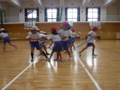 明日はいよいよ運動会!「棒引き」の最後の練習を運動場でしたかったのですが,1時間目は小雨のため体育館での確認となりました。団体競技「棒引きの見どころ」は,まず組別の入場です。組ごとに少しですがダンスを披露しながらの入場です。試合で使う竹の棒を持って入場する子もいます。試合はパターンを変えて何試合も行います。20秒で決着がつくのでお見逃しなくおねがいします!