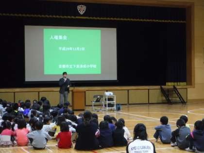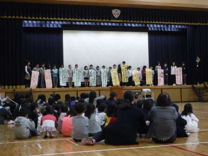 12月のなかまの日ということで人権集会がありました。10月から取り組んできた各クラスの人権目標や成果・課題について発表し,校長先生から教育を受ける権利についてのお話をしていただきました。