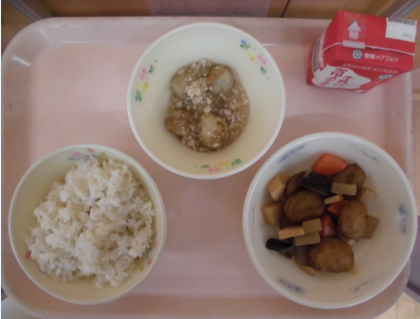 今日の「揚げ里いものあんかけ」は,味付けをした里いもを揚げ,その上にかつお節の風味がきいた鶏ひき肉入りのあんをかけていただきました。カリッと,もちっとした食感の里いもに,あんがよく合っていて「おいしい!」の声がたくさん聞こえてきました。