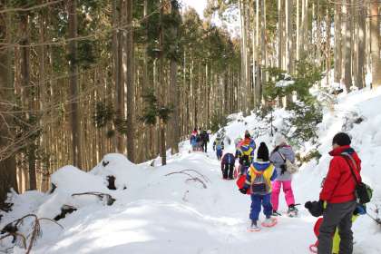 「カンジキ」をはいて、新雪の雪を踏み踏み歩く雪中ハイキング。
