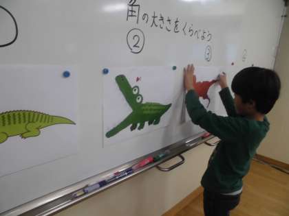 算数の「角とその大きさ」の学習では,わにや恐竜の口を具体物を使ってその大きさを比べをしています。
