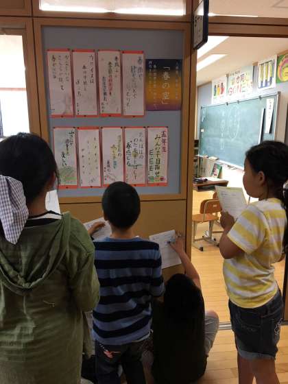 子どもたちは以前,国語科の授業で,春らしいものや様子を俳句に書き表しました。作品の出来栄えが素晴らしかったので,今日の授業で鑑賞会を行い,友だちの俳句の良さや工夫点を見つけました。次に俳句を作る場面で活かしてもらいたいと思います。