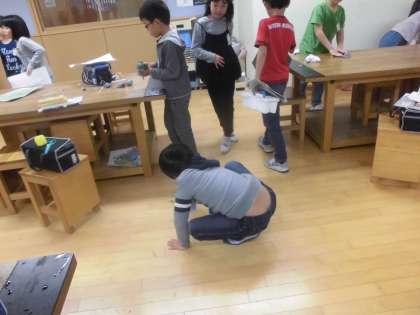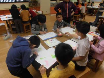図工の交流では,「絵の具でゆめもよう」という単元で,好きな色の画用紙にローラー・タンポ・歯ブラシ・ストロー・割りばしなどいろいろな道具を使って夢の模様をつくりました。いろいろな道具のあるコーナーを周りながら意欲的に制作活動ができました。出来上がった作品を見てみんな満足そうでした。雑巾がけなどの後片付けも最後までしっかりすることができました。