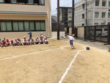 5月16日(水)今日は新体力テストの最後の種目「ソフトボール投げ」に挑戦しました。運動場に描かれた線を見て「ここで投げるんだ」と,うれしそうにしている子ども達でした。練習の後,いよいよ本番少しでも遠くに投げるため,サークルの中で助走をつけて力いっぱいボールを投げてがんばりました。