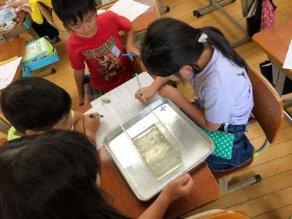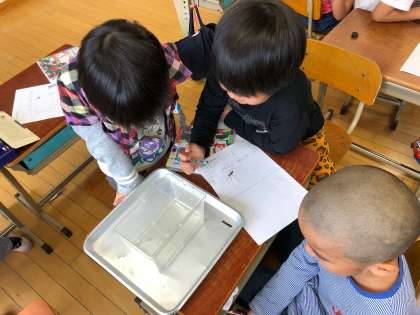 6月6日(水)生活科の学習でアメンボの観察をしました。この前,国語科で勉強した動く物の観察名人になろうを思い出し,アメンボの泳ぎ方をみんなで観察しました。手足の動かし方や,動いている様子に音を付けて言葉に表したり,アメンボの手の動かし方をまねしたりして観察の記録を書きました。