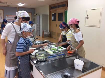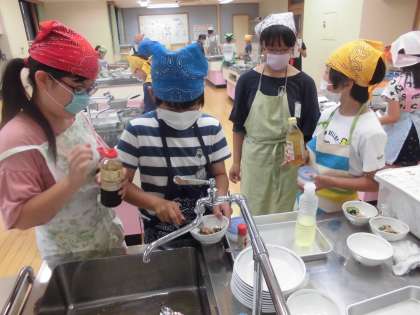家庭科の「おいしい楽しい調理の力」の単元で,「カラフルコンビネーションサラダ」と「ほうれん草のおひたし」を作りました。グループで役割分担をし,協力し合って活動しました。自分たちで作った料理を食べている時に,子どもたちから「やっぱりみんなで作った料理は格別だ。」,「料理を通して仲が深まった気がする。」などの声が聞こえてきました。