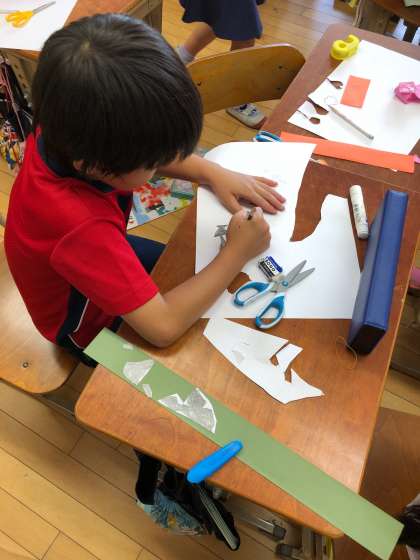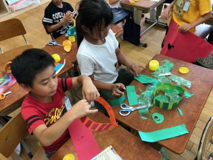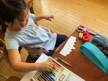 6月7日(木)図画工作の学習で「わっかでへんしん」をしました。細く切った画用紙を切り抜いてお面をつくったり,腰に巻いてベルトやスカートにしたりして工作を楽しみました。少し作って,かぶって,少し作って,かぶってと出来上がりや着けられるかを確かめながら作っていました。