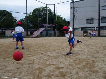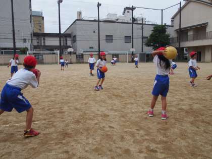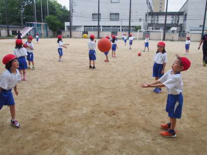 体育の学習でボールあそびをしました。一人でボールを上に投げてキャッチしたり,二人でボールを投げ合ったりしました。