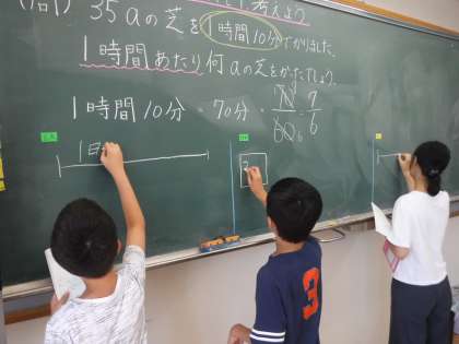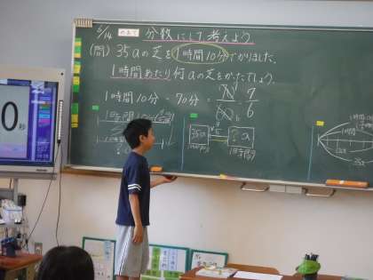 分数のわり算を使って,1時間あたりの量を求める問題にチャレンジしました。