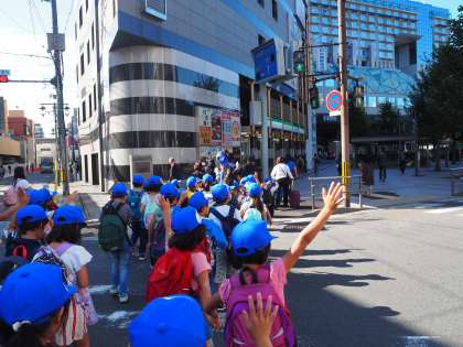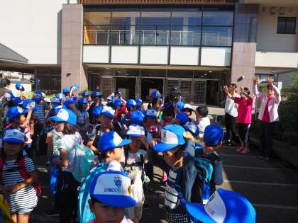 秋の遠足にいきました。お見送りの先生方に,元気よく