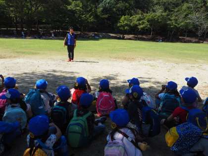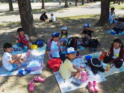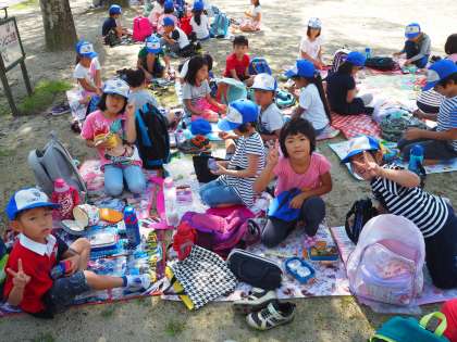 クイズラリーを一緒に回った2年生のお兄さん,お姉さんとお弁当を食べました。