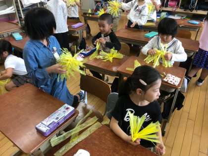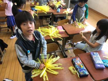 10月4日(木)運動会の小道具を作りました。2年生団体演技「レッツ・ダンス」で踊る時に腕につけるため,一人一人がビニールひもとゴムを使って頑張りました。はじめはゴムにひもをつけるのに時間がかかっていましたが,繰り返し何個もひもをつける間に手際よく楽しみながら作ることが出来ました。運動会の当日に使うのを楽しみにしている様子でした。