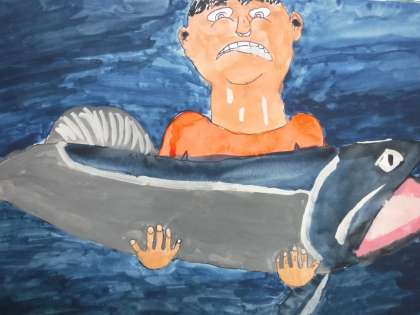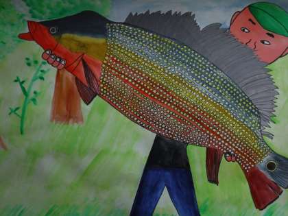 1組は,「怪魚ハンター,世界をゆく」。大きな魚,長い魚,太い魚・・・色や形を工夫しながら,写実的に描くことができました。
