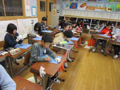 初めて触る彫刻刀は緊張するようで,ゆっくりゆっくりと彫り進めています。