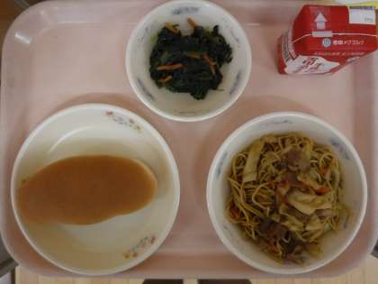 今日はソース味が食欲をそそる「ソース焼そば」がでました。豚肉やキャベツなどの具材とめんがソースとよくからんでおいしく仕上がりました。久しぶりの麺料理に子どもたちは喜んで食べていました。