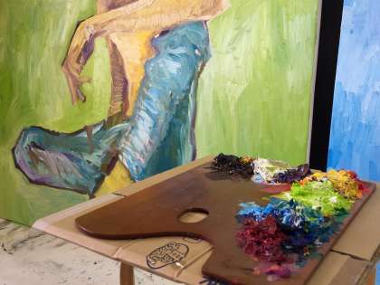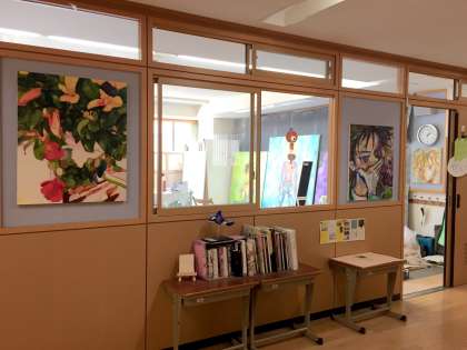 現在,杉本昌之・東根美沙紀が3年生の隣の空き教室を制作室として利用しています。2人とも油絵に取り組んでいます。