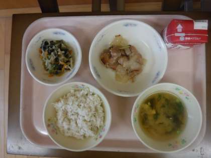 今日は下味をつけた鶏肉と玉ねぎをいっしょにてり焼きにした「鶏肉のてり焼き」が出ました。オーブンで焼くことで柔らかく仕上がり,甘くなった玉ねぎといっしょにおいしく食べられたようです。「玉ねぎが苦手だな。」と言っている子もいますが,甘く柔らかくなると食べやすいようです。苦手だと思っている食べ物でも,給食からおいしい食べ方が見つかればと思います。