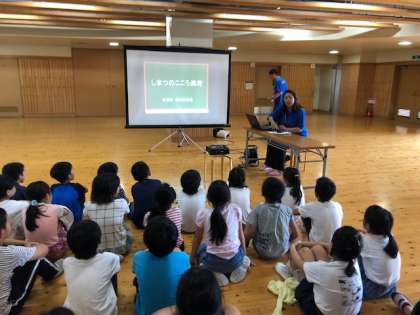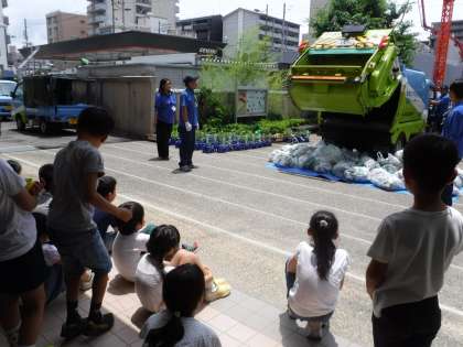 京都市環境局の方に来ていただいて,ごみの処理の仕方や減らす方法などについてお話いただき,パッカー車にごみをいれる体験をしました。