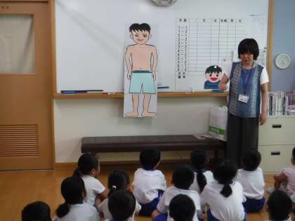 1年生の身体計測がありました。今回は,養護教諭の池田先生から「すいみん」についてお話をしていただきました。