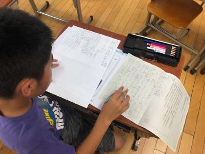 浄水場や高瀬川,四年一組についてなど,それぞれが新聞にしたいことを決めて新聞を書いています。下書きが完成し,わりつけをして,いよいよ本番です。