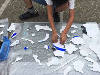 今回の詩に合わせて,様々な形をした水彩絵の具の筆跡や飛沫を文字の上にコラージュしてみました。素材となるパーツは別作品を描いた時に出来たものを利用しました。貼り付ける作業は子どもたちにもお手伝いして頂きました。意図しない構図が生まれて面白かったです。