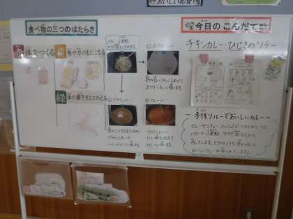 今日は,チキンカレーとひじきのソテーの組み合わせでした。ごはんにかけて食べるカレーは,やはりごはんが進みやすようで食器をきれいに空にしていました。学校のカレーはルーから給食室で作っています。毎日の献立を紹介しているホワイトボードでは,給食で使っているルーの種類について紹介をしました。