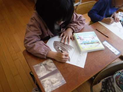 どんぐりや落ち葉など自分の宝物をよく見ながら,カードをかくことができました。