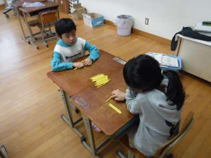 100までの数や100を少しこえる数について,数字でかいたり正しく数えたりできるようにします。単元の最初は,数え棒を使ったゲームをしました。