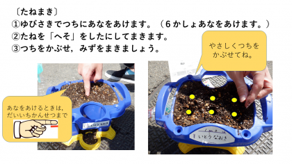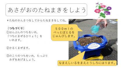 あさがおのたねをおうちのひとといっしょにまいて,げんきなめがでるように まいにちこえをかけながら おせわをしてあげてね。