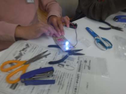 出来上がるとLEDが3色に光り,子どもたちはみんな目を輝かせてみていました。今日はモノづくり体験だけではなく,京都の最新の技術についてや,その会社を起業した方々のことも学び,大変よい時間を過ごすことができました。
