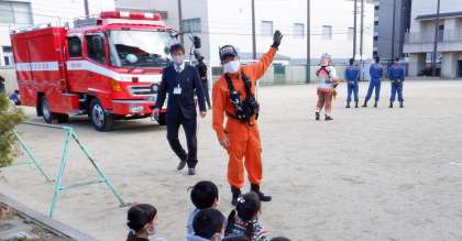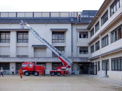 119番の日(11月9日)ということもあり,学校に「はしご車」が来てくれました。消防隊の方にはしご車の説明をしてもらったり,実際に救助をする様子を見せてもらったりしました。とても良い機会なので,1年生も救助活動の様子を見学させてもらいました。空に向かって伸びていくはしごの長さに圧倒されながら,集中して見学していました。