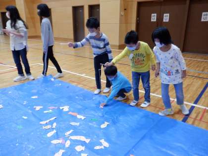 その1つとして,休み時間にみんなが楽しめる『魚釣りゲーム』の時間を作ってくれました。1年生の子どもたちは,6年生のおにいさん・おねえさんにつり方やコツを教えてもらいながら楽しんで釣りをしていました。
